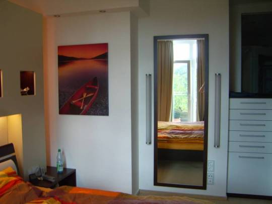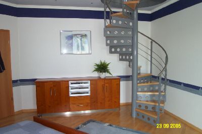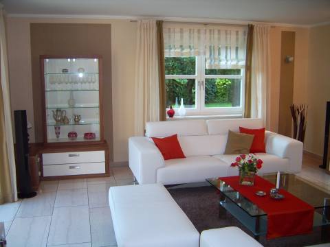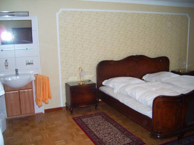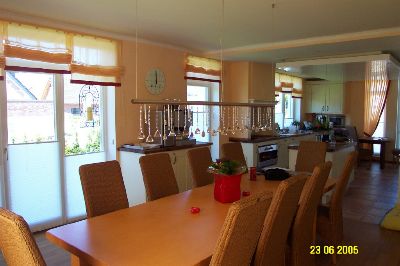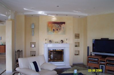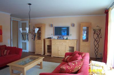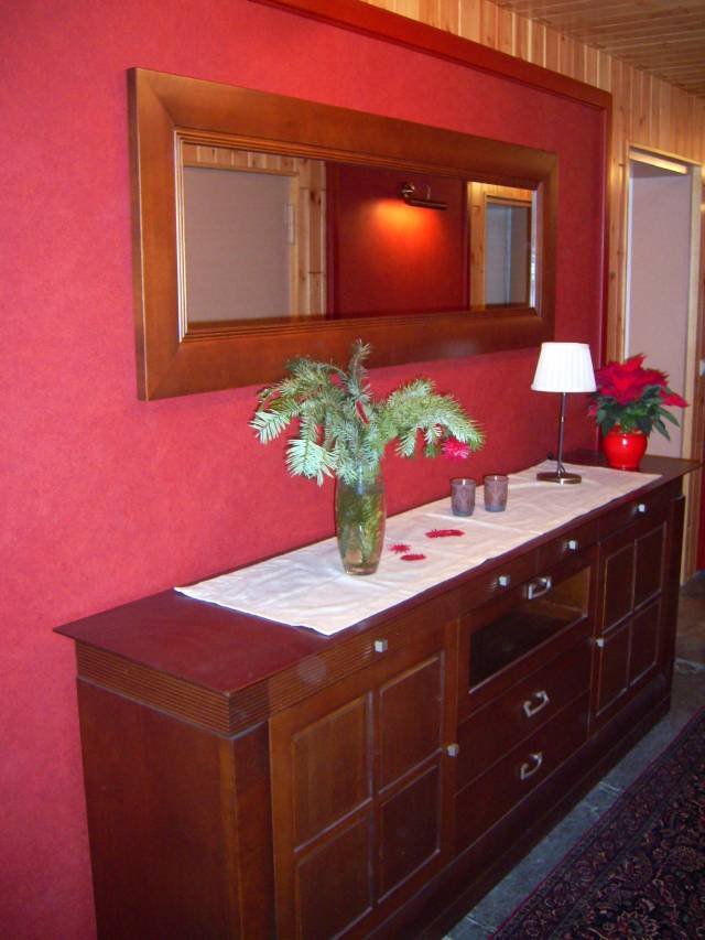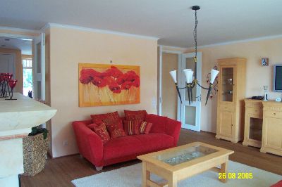 Pinienmöbel auf dunklem Parkett, eine Marmorspachteltechnik an den Wänden und warme Farben bei Polstermöbeln und Gardienen, lassen hier den Urlaub nicht enden.