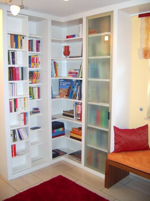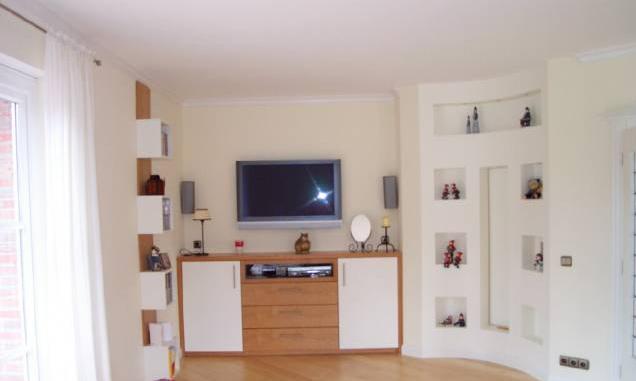16. Mit dem Rundregal rechts wird ein Schornstein getarnt. Die Technik für den Fernseher verschwindet hinter der vorgezogenen Rückwand für das Gerat.