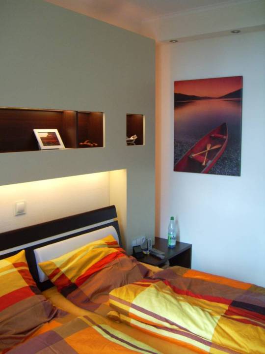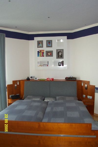 5. Ein Beispiel für ein  beleuchtetes Kopfteil. Das Bett wird umrahmt von einer lackierten Platte, in dei verschiedene Beleuchtungselemente eingebaut sind. So entstehen Fächer für Bücher und Bilder. Das Licht ist atürlich gesondert schaltbar, passend für jede Stimmung.
