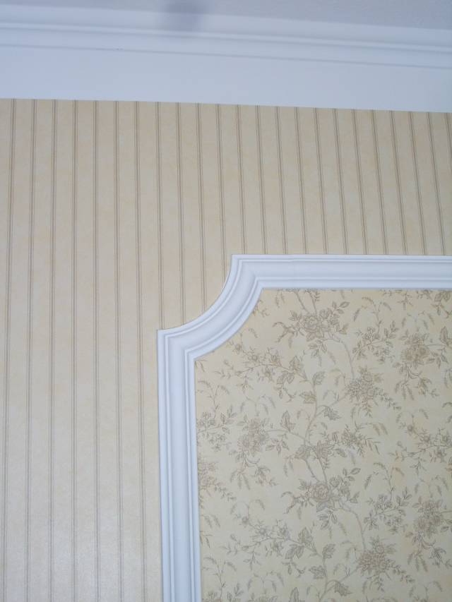 14. Eine MdF Platte mit roter Tapete und Profilleiste, nimmt der Wandverkleidung ihre Einförmigkeit.
